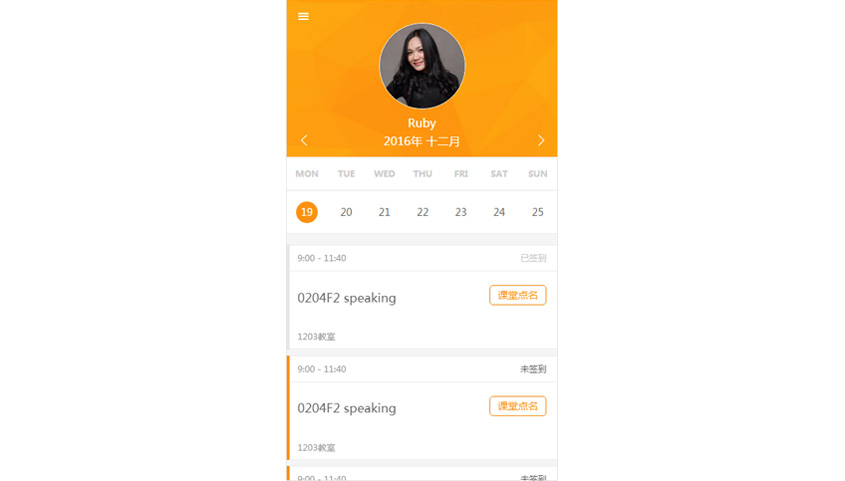- 個(gè)人首頁: 按周查看個(gè)人課程信息及簽到記錄、課堂點(diǎn)名(僅老師端)